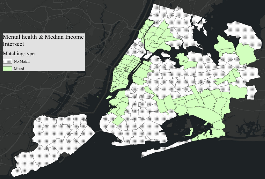 To identify potential correlations, I compared the clustering results of these socioeconomic variables with the clustering patterns of mental health resource density. The overlay maps below illustrate the intersections of clustering patterns, providing a clear visual representation of the areas where these variables align or diverge.