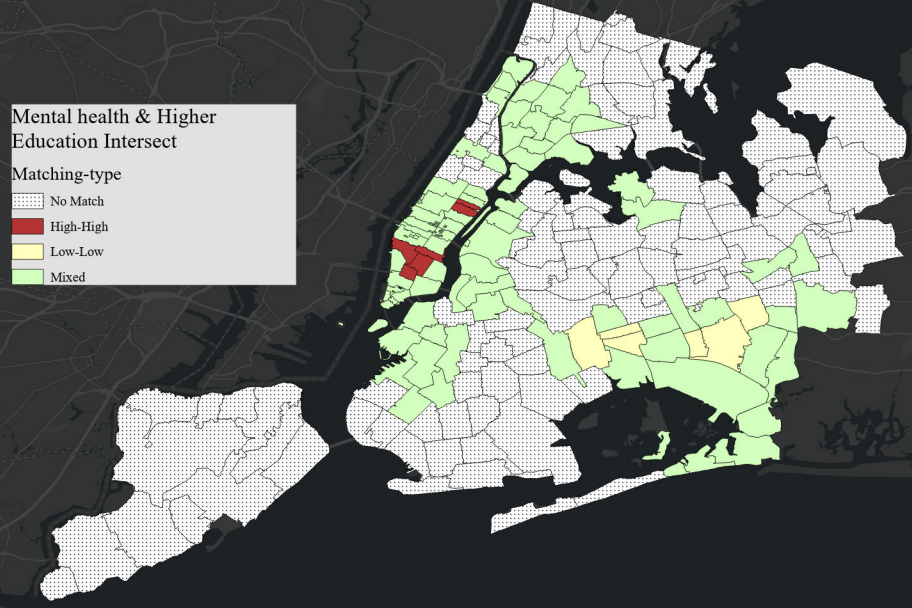 I applied Moran’s I to population density, higher education levels, uninsured population, median income, and mental health resource density to identify whether these variables exhibited significant spatial clustering within New York City. This step was crucial to understanding the spatial patterns of these variables and to evaluate their potential relationship with the distribution of mental health resources.